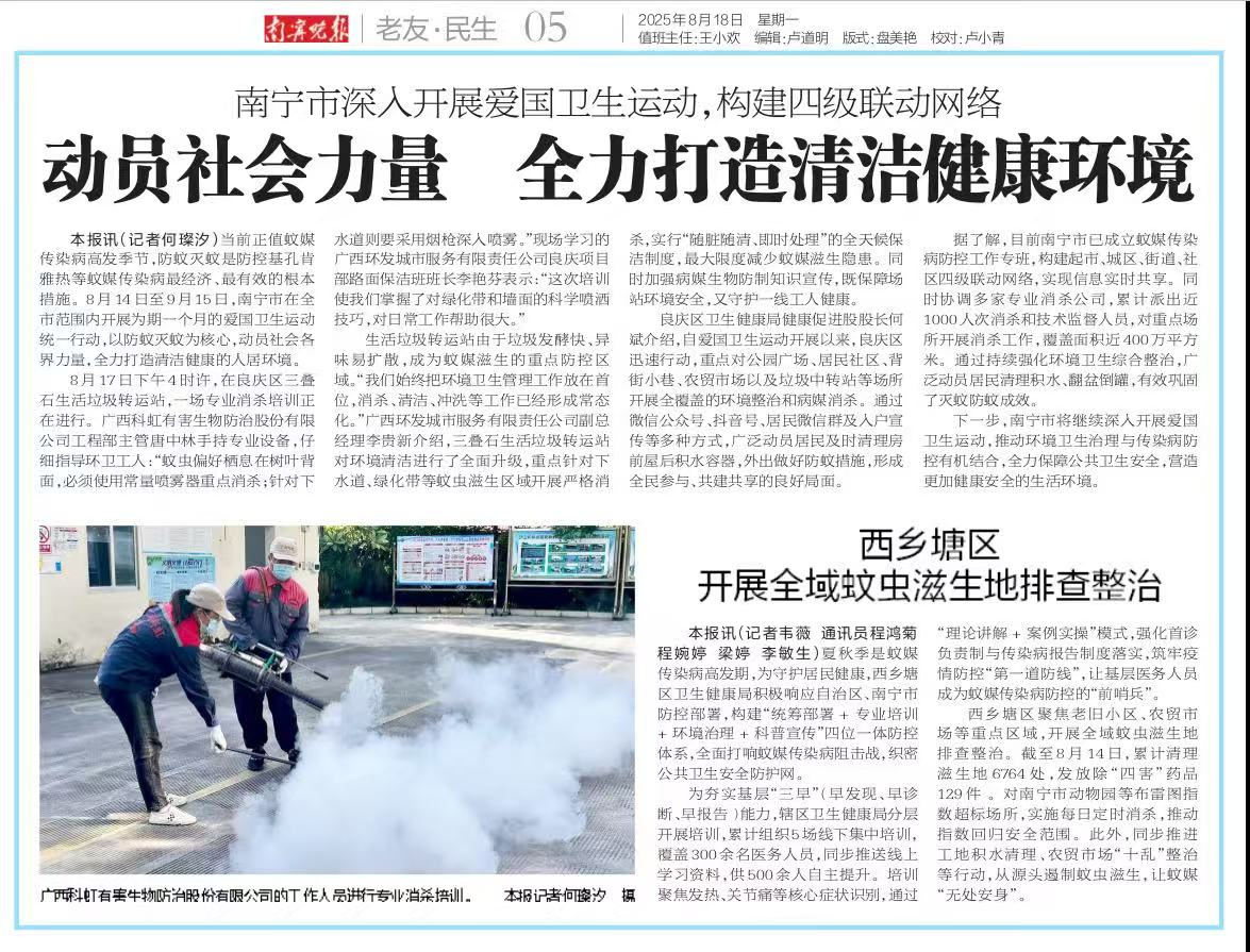 當前正值蚊媒傳染病高發(fā)季節(jié),防蚊滅蚊是切斷基孔肯雅熱等疫病傳播最經(jīng)濟、最有效的措施。為防范疫病傳播,打造清潔健康的人居環(huán)境,南寧市委市政府于8月14日至9月15日在全市范圍內(nèi)開展了為期一個月的愛國衛(wèi)生運動。市政府動員全社會各界力量,統(tǒng)一行動,群策群力,以防蚊滅蚊為核心,打一場愛國衛(wèi)生保衛(wèi)戰(zhàn)。在這場全民行動中,廣西科虹有害生物防治股份有限公司憑借專業(yè)的技術(shù)和高效的服務(wù),積極響應(yīng)政府號召,走在了這場運動的第一線。